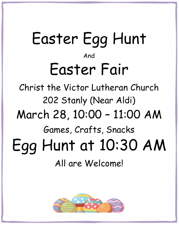 Christ the Victor will hold the Easter Outreach event in the play yard and Fellowship Hall at 202 Stanly, Victoria, TX 10:00 -11:00 Games, Crafts, Snacks with Easter Egg Hunt at 10:30